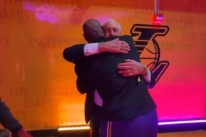 莱利湖人雕塑之日,詹姆斯和莱利拥抱。