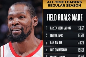 本场比赛,杜兰特生涯运动战进球数超过奥拉朱旺(10749),升至历史第10位。