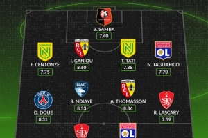 体育资讯1月5日讯 法甲第17轮联赛已经完赛,whoscored也统计了本轮评分最佳阵容,南特、朗斯、布雷斯特、里昂各2将入围。